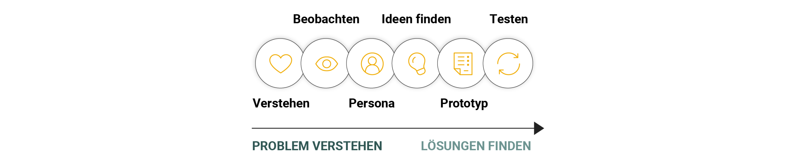 Design Thinking ist dabei ein iterativer Prozess: die Reihenfolge muss nicht starr eingehalten werden, sondern es soll Raum für einen bedarfsorientierten Wechsel zwischen den Schritten geben.