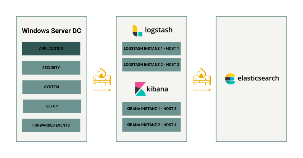 Zwischen dem Windows Domain Controller und dem Logstash Server befindet sich in der Regel eine Firewall. Der Domain Controller hat keinen direkten Zugriff auf den Elasticsearch Server (Datenbank). Der Kibana Service ist auf dem Application Layer installiert. Somit befindet sich zwischen allen Komponenten eine Firewall.