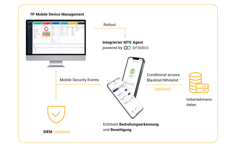 Für die Mobile Threat Defense Funktionalität setzen wir bewusst auf die bewährte Technologie unseres europäischen Partners Pradeo, einem Spezialisten für mobile Sicherheitslösungen. Pradeo liefert die Threat-Detection-Technologie. 7P verantwortet Integration, Governance und Compliance-Einbettung. Durch diese Partnerschaft verbinden wir spezialisierte Mobile-Security-Expertise mit unserer langjährigen Erfahrung in regulierten Branchen und sicherem IT-Betrieb.